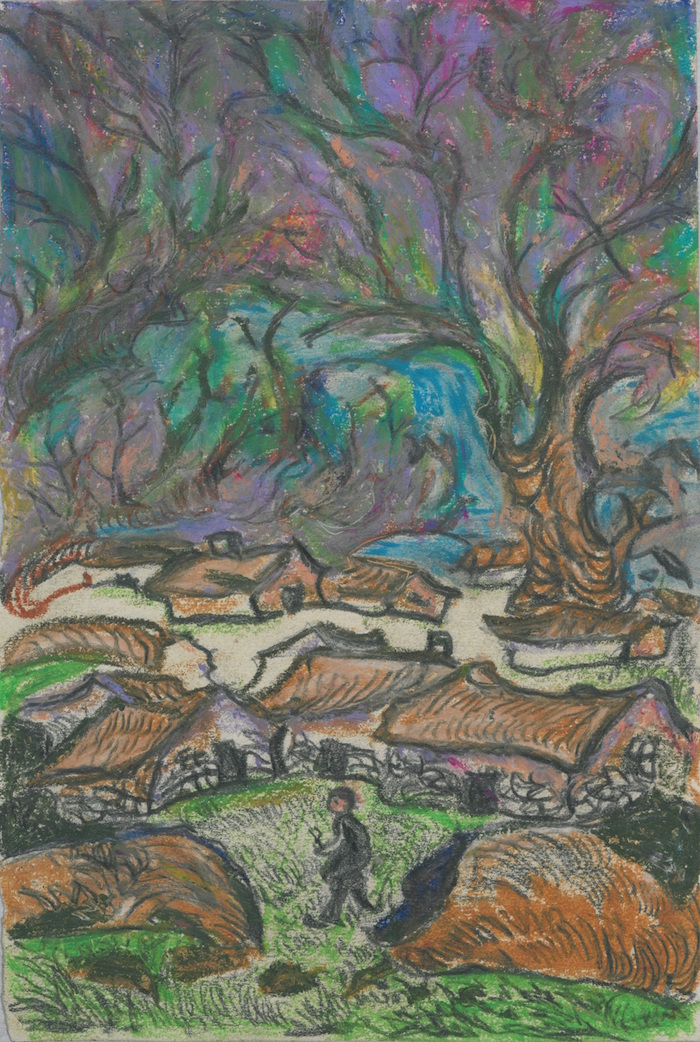 展廳的最后一部分呈現(xiàn)的是劉峴的藝術(shù)創(chuàng)作。包明吉表示,“這些作品大多是劉峴晚年因身體狀態(tài)導(dǎo)致無法手握刻刀后而改用油畫棒等其他手段所創(chuàng)作的作品,包括晚年為《野草》再做的插圖等。”