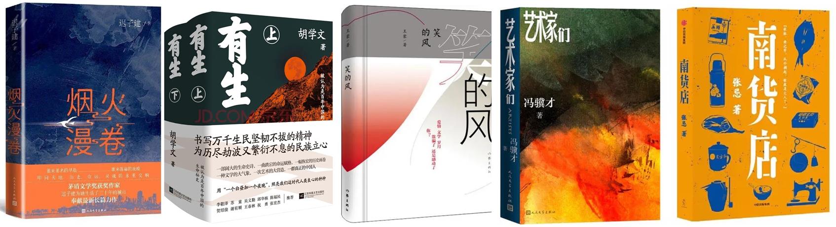 從左到右:遲子建《煙火漫卷》、胡學文《有生》、王蒙《笑的風》、馮驥才《藝術家們》、張忌《南貨店》