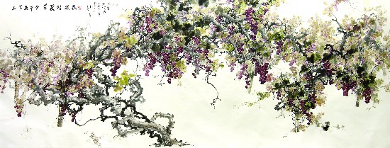 “連枝盈紫氣,滿架發(fā)清香。疑自瑤池下,人間獻(xiàn)瑞祥?!边@是我在欣賞盧一心先生以葡萄為題材創(chuàng)作的諸多作品時(shí)乘興所撰的一首短詩。