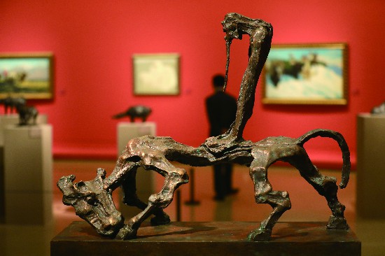 而藝術(shù)家的耕耘則是創(chuàng)造藝術(shù)品,為生活增添色彩。從明萬(wàn)歷年間的《百牛圖》,到齊白石富于童趣的牛、豐子愷祥瑞的牛、李可染憨厚敦實(shí)的牛、吳作人勇猛精進(jìn)的牛、董希文開(kāi)墾土地的牛、熊秉明溫厚拙樸的孺子牛、劉開(kāi)渠萌萌噠的漢白玉牛、潘鶴奮發(fā)進(jìn)取的拓荒牛……這些作品讓我們的展廳成為了充滿(mǎn)豐收景象、蘊(yùn)含著多元美的殿堂。當(dāng)然,這其中不僅以牛為題材的作品令人目不暇接,還有許多表現(xiàn)人們生產(chǎn)生活的優(yōu)秀作品,如方增先的《粒粒皆辛苦》、廣廷渤的《鋼水·汗水》、沈鵬的書(shū)法對(duì)聯(lián),靳尚誼的《塔吉克新娘》等。走進(jìn)這個(gè)美的天地,你就會(huì)不自覺(jué)地與自然對(duì)話,與那些充滿(mǎn)生機(jī)的藝術(shù)家所描繪、塑造的人物對(duì)話。
