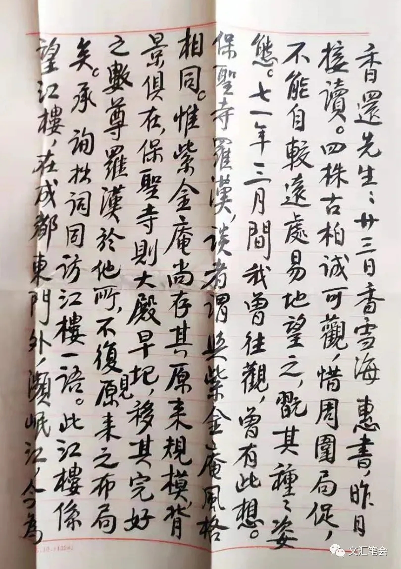 香還先生:廿三日香雪?;輹?shū),昨日接讀。四株古柏可觀,惜周?chē)执?,不能自較遠(yuǎn)處易地望之,玩其種種姿態(tài)。七一年三月間我曾往觀,曾有此想。保圣寺羅漢,讀者謂與紫金庵風(fēng)格相同。唯紫金庵尚存其原來(lái)規(guī)模,背景俱在,保圣寺則大殿早圮,移其完好之?dāng)?shù)尊羅漢于他所,不復(fù)見(jiàn)原來(lái)之布局矣。承詢(xún)拙詞同訪江樓一語(yǔ)。此江樓系望江樓,在成都東門(mén)外,瀕岷江,今為公園。當(dāng)年朱先生寓居望江樓對(duì)面,地名宋公橋,我往訪,輒過(guò)橋同登望江樓吃菜,自于成都分別之后,未嘗再謀面,其時(shí)為一九四五年八月將盡。懷想彼時(shí)談敘之樂(lè),能不感慨乎。尊大人年近八十,想必康健。其居何街何弄,侍奉者何人,均愿知之。語(yǔ)我作適當(dāng)鍛煉,甚感,唯養(yǎng)成習(xí)慣為難,而又無(wú)人為之督責(zé)。平時(shí)只在室內(nèi)或庭中來(lái)回踱步,得伴則近處走走耳。匆復(fù)不一,即請(qǐng)