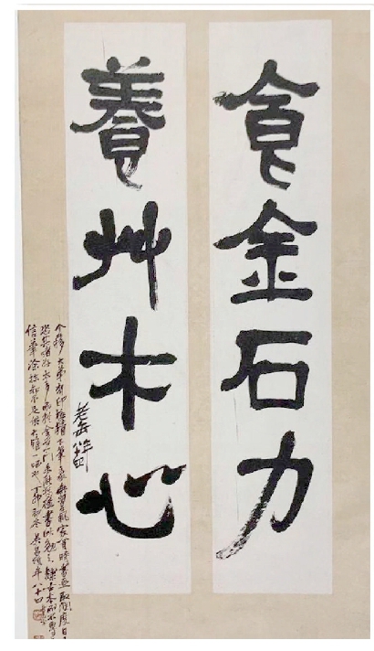 吳昌碩贈予王個簃的隸書四言聯(lián)“食金石力,養(yǎng)草木心”