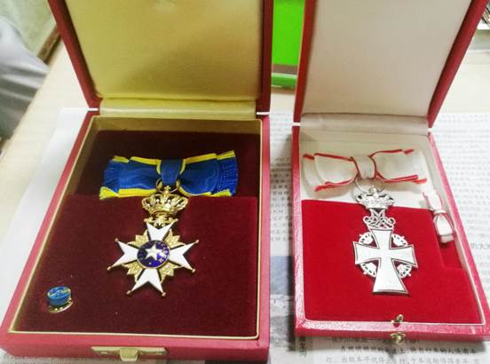 左:2017年石琴娥獲得瑞典皇家北極星勛章。右:2010年,為了表彰石琴娥的貢獻(xiàn),丹麥王儲在上海世博會(huì)丹麥館向石琴娥頒發(fā)了丹麥國旗騎士勛章。