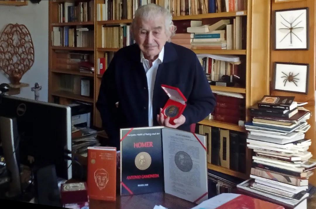 加莫內(nèi)達(dá)在位于西班牙萊昂市達(dá)瑪索·麥力諾路的家中收到荷馬獎?wù)录啊都幽獌?nèi)達(dá)詩選》