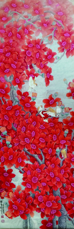 那些紅花也不是一味的殷紅。如果沒有變化,作品也就不能如此栩栩如生了。在這里畫面的紅,有深有淺,有濃有淡,不同的光線,不同的側(cè)面,所呈現(xiàn)的紅也各有不同;而動靜藏露、姿態(tài)各異的鳥兒點綴其間,卻也不是可有可無的,它們增加了畫面的活潑,使木棉花更顯妙趣橫生。