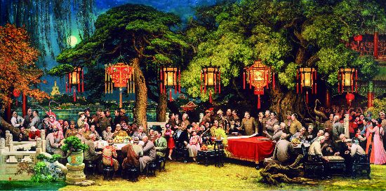 油畫《良宵》由畫家劉宇一于上世紀90年代創(chuàng)作。該畫生動地再現了新中國成立后的第一個中秋之夜,黨和國家領導人、民主黨派人士及群眾代表共慶中秋夜的祥和景象,展現了黨和國家蒸蒸日上、民族團結和睦、人民幸福安康的美好圖景。該作在中國美術史上有較大影響,至今仍陳列在毛主席紀念堂。