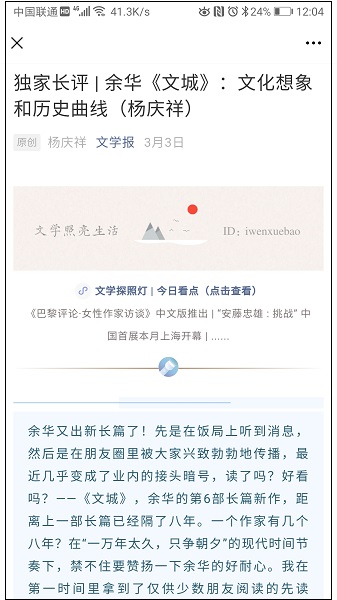 3月11日,“一點(diǎn)資訊”APP推出文化熱點(diǎn)專題:“那個(gè)寫《活著》的余華又回來了?新作《文城》被評(píng)‘爽文’引來兩極化評(píng)價(jià)”,從關(guān)于《文城》的簡(jiǎn)介、“正方觀點(diǎn)”、“反方觀點(diǎn)”三方面收攏歸納討論聲音,并允許用戶自由評(píng)論,發(fā)布讀后感言。