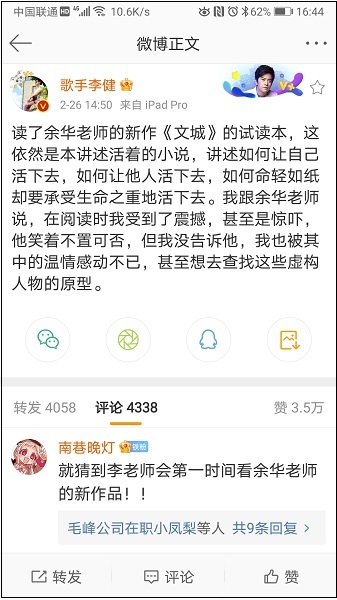 2月26日下午,李健發(fā)微博談?wù)摗段某恰贰=刂?月22日,該條微博已獲3.5萬贊,轉(zhuǎn)發(fā)、評(píng)論各4000余次。