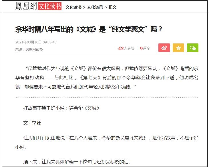 3月10日,鳳凰網(wǎng)-文化頻道發(fā)布青年批評(píng)家李壯文章《好故事不等于好小說:評(píng)余華〈文城〉》。