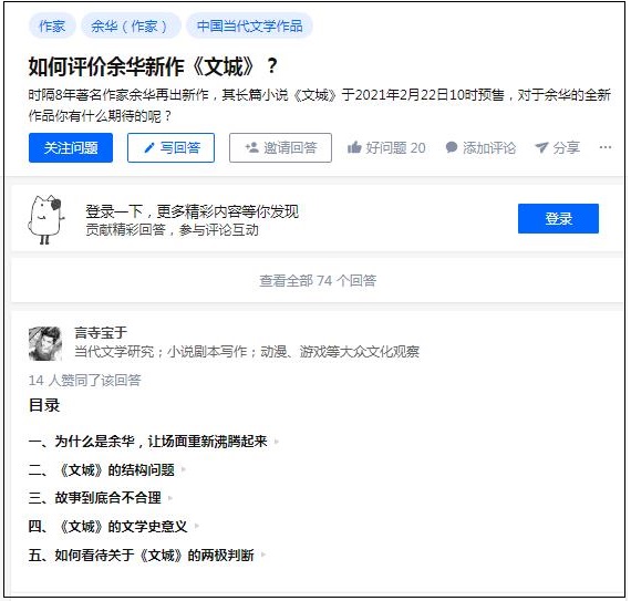 在知乎“如何評(píng)價(jià)余華新作《文城》”的問答中,已有74條長(zhǎng)回答。圖為知乎用戶“言寺寶于”的回答。“言寺寶于”從《文城》的結(jié)構(gòu)、故事、文學(xué)史意義等角度出發(fā),并著意于作品出版后的“兩極判斷”,表達(dá)了自己的觀點(diǎn)。