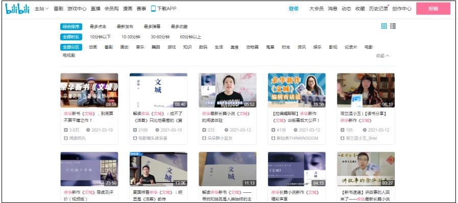 值得關(guān)注的當(dāng)然還有很多來自普通讀者的聲音,在微博、知乎、抖音、B站上,年輕受眾對(duì)這部余華新作也保持著極高的熱情,不僅有自媒體接連發(fā)布作品分享讀后感,還有圖書營(yíng)銷號(hào)制作了“《文城》金句摘抄”視頻合集。網(wǎng)友們的回復(fù)也很精彩,有人說“好像所有主角的名字都帶‘?!帧保腥苏f“《文城》明顯是《活著》的前傳”。3月11日,“一點(diǎn)資訊”APP推出文化熱點(diǎn)專題,對(duì)《文城》進(jìn)行整體介紹,匯聚了部分關(guān)于作品的正面、反面觀點(diǎn),并允許用戶自由發(fā)布評(píng)論及讀后感言。3月12日,新經(jīng)典公司在B站上傳了“拉編輯聊聊”視頻“余華新作《文城》出版幕后大公開”,《文城》責(zé)編白雪出鏡和大家講小說編輯背后的故事,在視頻中白雪對(duì)書名、封面、印數(shù)、小說特點(diǎn)等方面都做了簡(jiǎn)明扼要且適應(yīng)B站內(nèi)容輸出風(fēng)格的介紹。