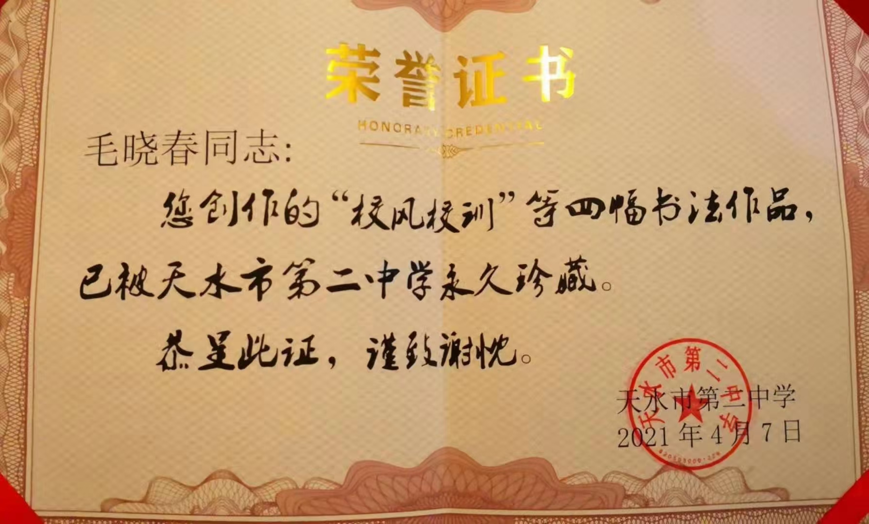 天水市二中坐落在甘肅省天水市麥積區(qū)馬跑泉古鎮(zhèn),始建于1953年,原名“天水縣第一中學(xué)”,1986年改稱“天水市第二中學(xué)”,是一所區(qū)屬省級(jí)示范性普通高中。2009年9月被省教育廳確定為“甘肅省高中新課程樣本學(xué)?!?。2012被評(píng)為甘肅省“教育系統(tǒng)先進(jìn)集體”、“甘肅省綠色學(xué)校”。幾十年來(lái),這所學(xué)校為國(guó)家輸送了許多優(yōu)秀人才。天水籍學(xué)者、作家、金石書法家毛曉春曾就讀于這里,1992年,毛曉春走出二中的校門,開始了他坎坷的游學(xué)生涯,經(jīng)過(guò)不斷的努力和成長(zhǎng),三十年后,已在京華事業(yè)有成毛曉春回到母校,在校領(lǐng)導(dǎo)的陪同下參觀了學(xué)校的基礎(chǔ)建設(shè)和文化建設(shè),把自己創(chuàng)作的部分作品捐贈(zèng)給母校,并在“博雅”大講堂上為學(xué)校高一高二的師生做了“守望家園 傳承文化”的專題講座。