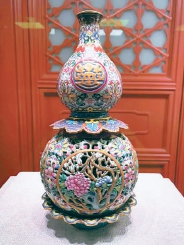 粉彩鏤空花卉紋葫蘆式轉(zhuǎn)心瓶