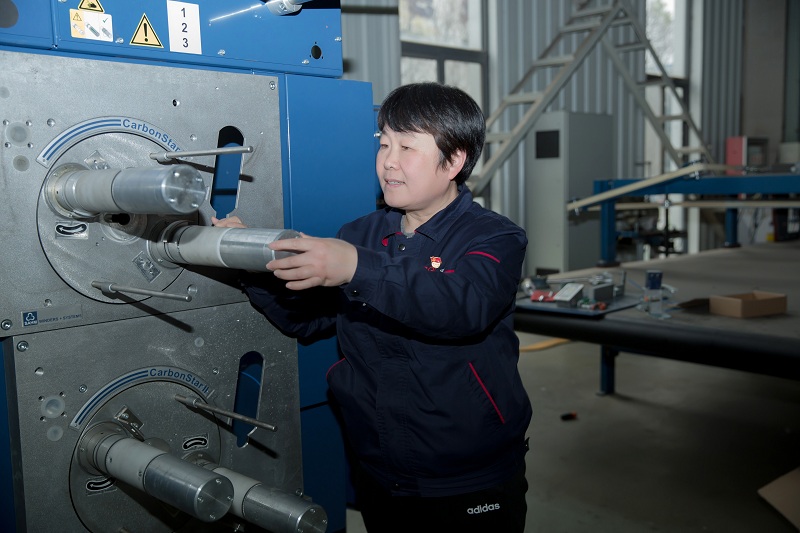 4月29日,這天上午,于素梅早早就來到了廠里,整理和打印為中復(fù)神鷹碳纖維公司高端碳纖維生產(chǎn)線設(shè)計的部分紡絲設(shè)備圖紙。她跟我說過:她對圖紙有感情。這我理解——1987年,大學(xué)剛畢業(yè)的于素梅被分配到連云港紡織機(jī)械廠(連云港鷹游紡機(jī)集團(tuán)有限公司前身)技術(shù)科工作,從此她就立足技術(shù)崗位,扎根生產(chǎn)一線。在具體工作中,她以一個年輕技術(shù)員的身份,完成了燙剪聯(lián)合機(jī)、水洗機(jī)、磁棒印花機(jī)等10余種新產(chǎn)品的設(shè)計的主創(chuàng)研發(fā)。那時候,她干得最多的工作,就是畫圖。2005年公司重組后,于素梅從紡織設(shè)備的開發(fā)投身于碳纖維裝備與技術(shù)研發(fā)工作。當(dāng)時,碳纖維屬于高性能纖維,在國外都屬于技術(shù)保密項目,而外國公司為了獲取更大的利益,只愿意高價出售產(chǎn)品,而不出售設(shè)備與技術(shù)。為打破國外碳纖維技術(shù)封鎖,董事長張國良稟持“為祖國爭光、為民族爭氣”的堅強(qiáng)信念,抽調(diào)于素梅等技術(shù)骨干專門攻克高性能碳纖維產(chǎn)業(yè)化難題。接下來,在兩個多月時間里,于素梅所在團(tuán)隊畫了近萬張設(shè)計圖紙,不斷解決遇到的各種難題,終于打通了聚合、紡絲、碳化全部工藝流程,完成了年產(chǎn)500噸原絲生產(chǎn)線和年產(chǎn)100噸碳化生產(chǎn)線全部裝備的研制工作,形成了百噸級碳纖維的成套生產(chǎn)線,并于2007年5月首次連續(xù)生產(chǎn)出合格的碳纖維。正是在此基礎(chǔ)上,于素梅與同事們相繼完成多條碳纖維生產(chǎn)線,以及碳纖維預(yù)浸布的復(fù)合材料預(yù)浸設(shè)備生產(chǎn)線的設(shè)備的設(shè)計開發(fā)工作,實(shí)現(xiàn)了T300/ T700/T800級碳纖維及原絲設(shè)備的全部國產(chǎn)化、規(guī)?;a(chǎn)。她和同事們研發(fā)的“干噴濕紡千噸級高強(qiáng)/百噸級中模碳纖維產(chǎn)業(yè)化關(guān)鍵技術(shù)及應(yīng)用”項目獲得2017年度國家科技進(jìn)步一等獎。今天,她要根據(jù)圖紙指導(dǎo)工藝人員明確其中的關(guān)鍵零部件,以提醒其在編寫加工工藝時的注意事項??紤]到進(jìn)口軸承供貨周期長,她又安排提前為采購人員提供設(shè)備中選用的進(jìn)口軸承型號及數(shù)量明細(xì)表,方便其與供應(yīng)商交流,避免因軸承交貨不及時影響設(shè)備裝配從而影響整個生產(chǎn)線的交付時間。就這樣說說做做,一個上午過去了。到了下午,她又開始了編寫中復(fù)神鷹公司購置的4米碳化線部分設(shè)備使用說明書工作。