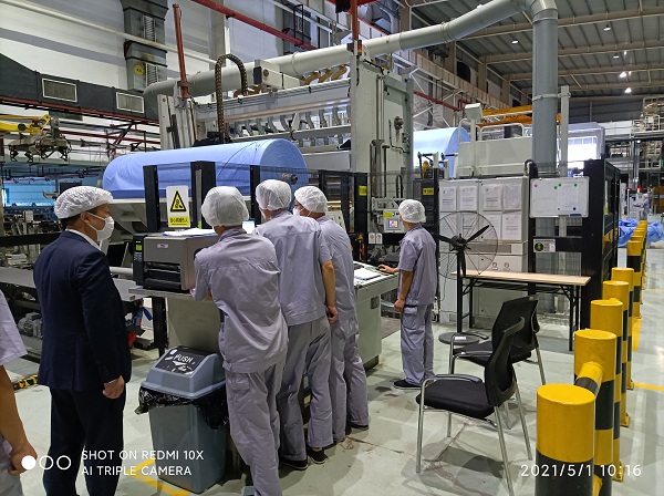 5月1日這一天,公司員工仍然在不同的崗位上辛勤工作,有的部門、車間在舉辦線上線下技術(shù)培訓(xùn);有的在進(jìn)行設(shè)備保養(yǎng)維護(hù)。上午10時(shí)許,農(nóng)行市分行公司業(yè)務(wù)部總經(jīng)理張松青、管戶經(jīng)理劉含方與公司一起,來到現(xiàn)代化、自動(dòng)化程度最高的萊芬一線車間,了解生產(chǎn)線運(yùn)轉(zhuǎn)、年產(chǎn)能及原材料庫存情況。只見偌大的車間,僅有8名工人在各自的工作臺(tái)上盯著儀表參數(shù)變化?;ぴ暇郾┏鲞M(jìn)料口傳送帶輸入,在機(jī)器人的操作下,生產(chǎn)線自動(dòng)完成進(jìn)料、熔噴、熔噴布成型、下線包裝全流程。比傳統(tǒng)生產(chǎn)節(jié)省人力成本80%,,而生產(chǎn)效率成十幾倍提高。作為現(xiàn)場親歷者,倍感振奮,從內(nèi)心感到掌握現(xiàn)代科學(xué)技術(shù)的產(chǎn)業(yè)工人是真正的英雄。