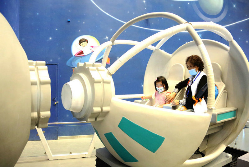 2021年5月19日,小朋友由家人陪同在中國(guó)科學(xué)技術(shù)館體驗(yàn)“飛船對(duì)接運(yùn)行” 。新華網(wǎng)發(fā)(劉廣生 攝于北京)