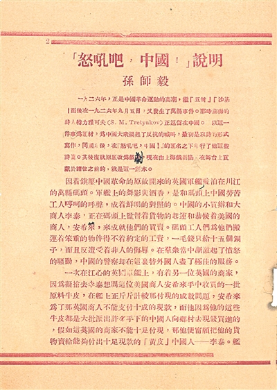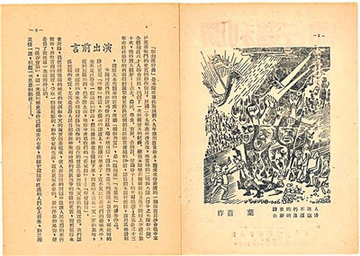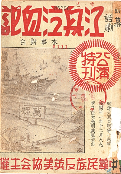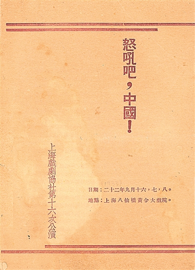 他所收集來的演出說明書中,有些劇目對當時的歷史和戲劇都提供了珍貴的研究價值。比如《怒吼吧!中國》是上世紀30年代左翼戲劇的一部重要作品,由蘇聯(lián)詩人特力雅可夫根據(jù)英美軍艦在四川萬縣迫害中國百姓的真實事件改編。他以詩的形式寫作,后由上海戲劇協(xié)會搬上舞臺。但在日軍占領上海后,當局為動員民眾將其改編為《江舟泣血記》?!督燮洝费莩稣f明書顯示,該劇曾在大光明戲院組織了演出。上海解放后,人民政府組織的第一次大規(guī)模演出也正是此劇,演出地點在文化廣場。