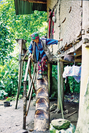 獨(dú)龍族傳統(tǒng)住房分為木壘房和篾笆房?jī)煞N,為了防潮、防霉、防野獸而離地建蓋。房屋與地面相連的獨(dú)木梯用一根圓木鑿出一個(gè)個(gè)臺(tái)階制成。攝于2013年。 楊學(xué)飛攝