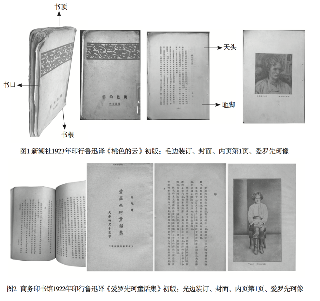 要達到最佳效果,“新潮社文藝叢書”毛邊本依靠的不僅是裝幀與版式設計,同樣還需要令設計得以實現(xiàn)的物質與技術基礎??梢哉f,“新潮社文藝叢書”利用了其時最精良的機械印刷條件。在紙墨方面,周氏兄弟留日時便已注意到歐式及日式毛邊本的封面多用皮革燙金或布面軟精裝,內頁墨勻紙潔,編印《域外小說集》時,就曾盡力模擬其質感,用仿呢布質地的厚羅紗紙做書面,用“上好洋紙”印本文,自謂“印的特別考究”6?!靶鲁鄙缥乃噮矔毖匾u此制,封面用仿布質的重磅木造紙或布紋紙,插圖用銅版紙,內文不再采用國內通行的質地脆弱、易氧化發(fā)黃的低價白報紙,而全部使用潔白光滑、不易變色、印字均勻的較高價道林紙。在印刷方面,“叢書”拼貼式地采用了其時最新穎的印刷技術。在同北京各印廠充分商討價格、理解技術后,李小峰等幾個新潮社員選定了京華印書局。作為商務印書館在北京設立的印刷所,1921年京華印書局大增設備后,躍升為北京30多處印廠中規(guī)模最大,技術最新,制版最精也是價格最昂貴的一個7。而魯迅為精益求精,又委托商務印書館上??倧S制三色版《桃色的云》作者像8。這里不妨與1922年商務印書館出版《愛羅先珂童話集》做一比較,同為愛羅先珂作品翻譯集,商務版作者像即為單色版照片,這是當時文集插圖的標配,三色版雖然清晰度高,但成本較單色或普通鋅版高出三倍至四倍,多用于畫冊、票鈔等,此前很少用于文集(《桃色的云》與《愛羅先珂童話集》形制對比見圖1、圖2)。
