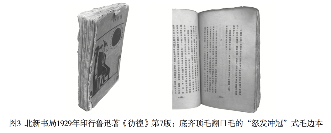 其實,《域外小說集》的三面毛邊、“新潮社文藝叢書”的書根書口毛邊是沿襲歐式及日式書裝的正統(tǒng)形式,而“怒發(fā)沖冠”式毛邊本卻是中國新文學出版自我實踐中的發(fā)明(“怒發(fā)沖冠”式毛邊本見圖3)。對于中式毛邊改制的原因,唐弢先生解釋為:“記得魯迅先生說過,洋裝書是直插的,用硬封面,毛邊在書根不受影響。中國尚沒有全用硬面精裝的條件。線裝書宜于橫放,向來的習慣是將書根磨光,寫上書名,以便隨時查閱。過去還有以寫書根為業(yè)的專門人才呢。何況舊式書箱很多是按橫放設計的,書根朝外,倘不加工,將只見到亂糟糟的一堆?!?9這是一個很有想象力的倒推:書籍被陳列、閱讀的方式反向影響了它被生產的樣式,“怒發(fā)沖冠”式毛邊切光書根是中國線裝書軟包造成的書籍橫放、書根向外露出習慣無意識的遺留,更值得玩味的是,我們就此抓住一只馬腳——看似創(chuàng)新的毛邊本,實則包含著線裝書使用習慣在洋裝書一隅的復活。那么,現(xiàn)代的毛邊書所繼承的是線裝書怎樣的形式經驗?