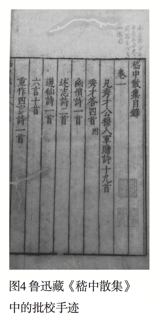 魯迅對《嵇康集》輯校甚精,此為魯迅所使用的底本之一,其校勘法即為在內頁天頭以朱筆批注。冊頁見《圖4:魯迅藏〈嵇中散集〉中的批校頁》,圖像轉自北京魯迅博物館編、韋力撰《魯迅藏書志(古籍之部)》上,中華書局2016年版,彩頁第8頁。