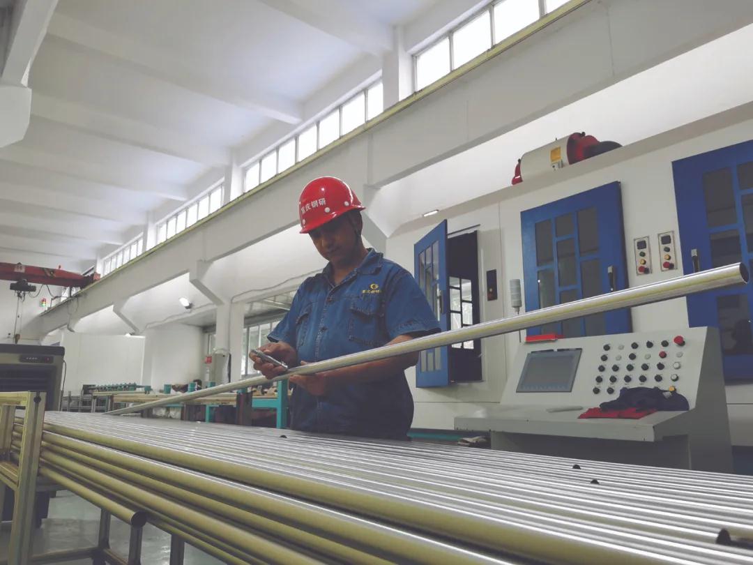 5月3日,重慶鋼鐵研究所有限公司技術(shù)帶頭人楊軍和在航空管生產(chǎn)線上查看管材出品質(zhì)量
