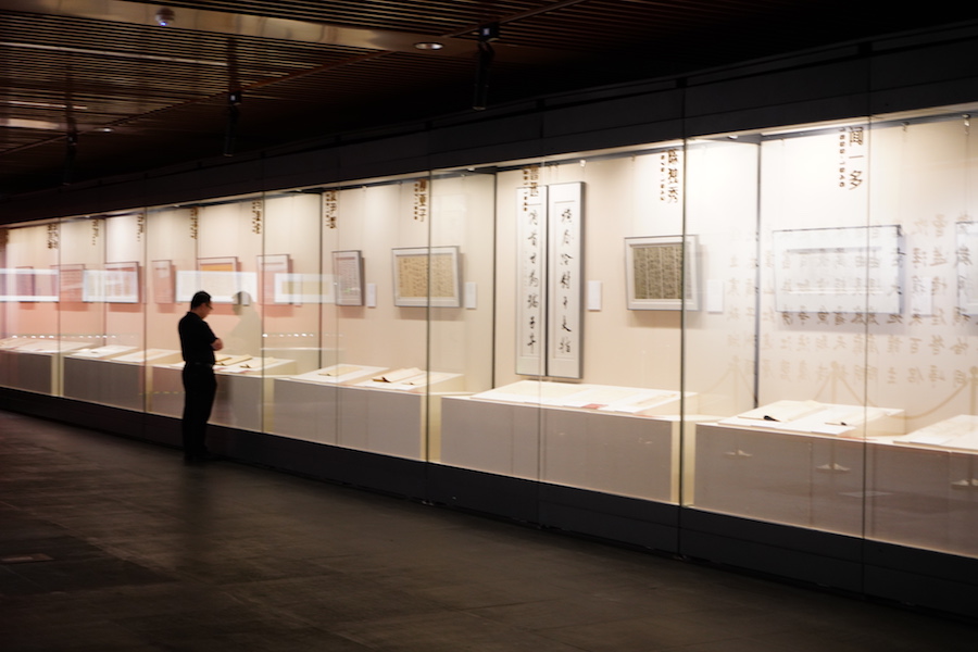 澎湃新聞?dòng)浾咴谡褂[的“光昭九域”篇看到,展廳布置素凈通透,展架上陳列的是名家手稿真跡或復(fù)制件,附有展牌介紹,墻上則懸掛著當(dāng)代書法家書寫的該名家的其他作品,以形成某種呼應(yīng)并體現(xiàn)出追慕先賢和新的藝術(shù)詮釋的意味。
