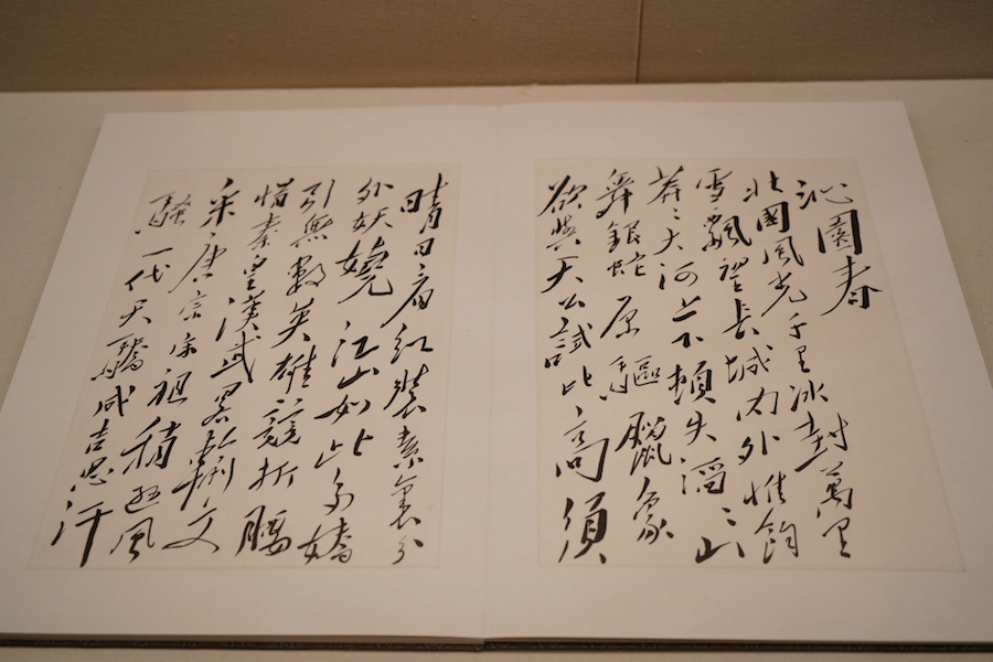毛澤東的書法作品常被引用。1957年春節(jié),李淑一寫信給毛澤東,談她讀了毛澤東詩(shī)詞的感想,并附了一首她在1933年聽到柳直荀犧牲時(shí)寫的《菩薩蠻·驚夢(mèng)》。5月11日,毛澤東回信,并作詞一首為贈(zèng)。1957年,毛澤東《蝶戀花·答李淑一》發(fā)表后,國(guó)家圖書館館員馮寶琳先生立即設(shè)法找到了李淑一同志,從她手里征集到記有這首詞的毛澤東親筆信,這是國(guó)家圖書館第一次征集到毛澤東的手跡。該件手稿原藏于國(guó)家圖書館,現(xiàn)存于中央檔案館,此次展出的是復(fù)制件。