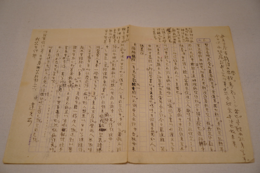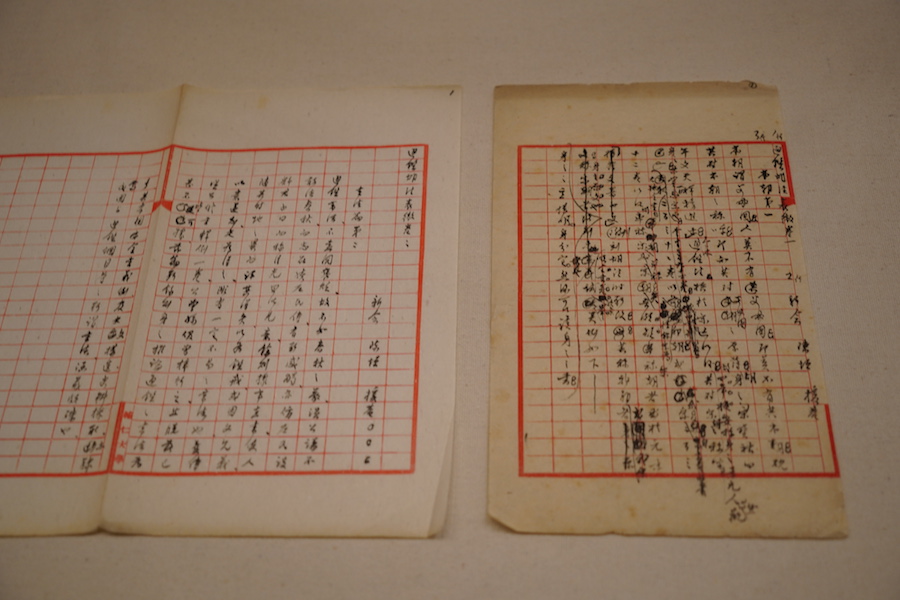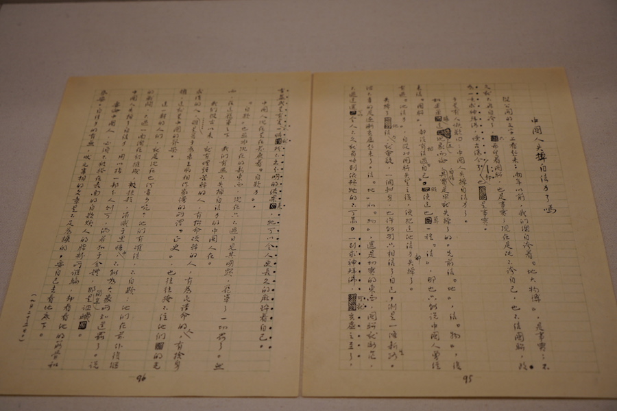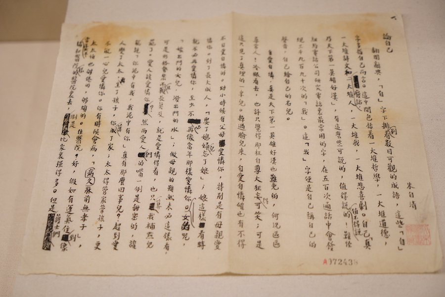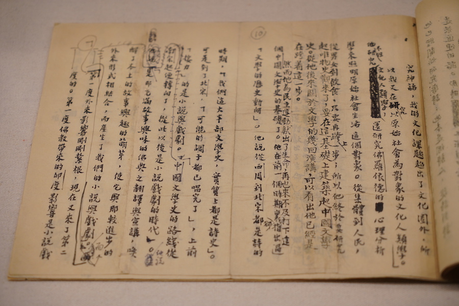 1946年7月15日,聞一多被國(guó)民黨特務(wù)暗殺身亡,同年11月,清華大學(xué)成立“整理聞一多先生遺著委員會(huì)”,由朱自清領(lǐng)銜,發(fā)動(dòng)清華大學(xué)中國(guó)文學(xué)系同仁搜集、整理、抄寫聞一多未刊遺稿,后出版。展覽現(xiàn)場(chǎng)中展出一件朱自清手書的序言,其中多處修改,也提及聞一多“終于要研究起唯物史觀,要在這個(gè)基礎(chǔ)上建筑起中國(guó)文學(xué)史”。