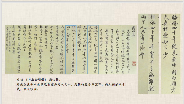 啟功出身滿清皇族,是雍正的第九世孫,可是他一點(diǎn)也沒受到皇恩的澤潤(rùn)。在他1歲時(shí),父親過世,由母親和姑姑拉扯大。在母親的安排下,他與章寶琛結(jié)為夫妻,相伴43載。妻子是啟功一生中最重要的人之一,兩人相依40年,從無爭(zhēng)吵。他還寫了很多悼亡詩(shī),向她述說在世的時(shí)候沒機(jī)會(huì)表達(dá)的心里話。這是啟先生為悼念愛妻所寫的《痛心篇》?!敖Y(jié)婚四十年,從來無吵鬧。白頭老夫妻,相愛如年少?!薄跋嘁浪氖?,半貧半多病。雖然兩個(gè)人,只有一條命?!?/p>