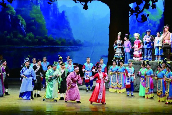 四、“劉三姐”是中國戲曲體系持續(xù)延展并凝結(jié)而成的國家形象、民族聲音。“劉三姐”是中國乃至世界共享的文化名片,從彩調(diào)劇到電影,再到多個藝術(shù)樣式,劉三姐的形象與題材已經(jīng)在時代變遷中具有了超越現(xiàn)實(shí)的符號象征意味,已經(jīng)成了用優(yōu)美的歌唱和善良人性來傳達(dá)生活理想的載體。在經(jīng)典的《劉三姐》舞臺藝術(shù)高峰之上,廣西壯族自治區(qū)戲劇院通過《新劉三姐》的創(chuàng)作,凸顯“劉三姐”文化對于當(dāng)代生活和新時代理想的涵攝與延展。今天舞臺上的“新”,當(dāng)然是保持戲曲本體而進(jìn)行的時代生活再現(xiàn),那種嶺南農(nóng)村、民族族群的現(xiàn)實(shí)狀態(tài)最容易像今天眾多的現(xiàn)實(shí)題材創(chuàng)作那樣,流于一般性的政策圖解,但是《新劉三姐》卻盡量避開這種創(chuàng)作誤區(qū),依然用歌唱的美、山歌的美、人性的美,來審視八桂大地這塊文化空間中人們的去留與生活。山水依然,而游子回歸,劇作中主人公最終走向的是中國人文的情感故園與精神駐地。這是該劇迥異于當(dāng)前現(xiàn)實(shí)題材創(chuàng)作的所在。《新劉三姐》將當(dāng)代社會生活中的諸多重大現(xiàn)象,例如新農(nóng)村建設(shè)、城市創(chuàng)業(yè)等等,全部融匯成現(xiàn)代青年男女對于真實(shí)感情的表達(dá),用情感的推移來呈現(xiàn)生活的變奏、精神的蛻變和生命的升華,這也印證了鄉(xiāng)土戲曲“以一國之事系一人之本”的文化根本要義。因此,這部作品推崇情感表達(dá),張揚(yáng)人性美好,肯定草根立場,表達(dá)詩性人生,崇尚民族共同意識,彰顯國家現(xiàn)代立場,形成與眾不同的戲曲舞臺面貌,以優(yōu)雅的藝術(shù)化、輕松的娛樂化來建構(gòu)現(xiàn)代舞臺,成為追步《劉三姐》藝術(shù)宗旨的又一部跟進(jìn)之作,也是“劉三姐”文化實(shí)現(xiàn)現(xiàn)代轉(zhuǎn)化的又一個精彩個案。該劇當(dāng)然更應(yīng)該用《劉三姐》60年的創(chuàng)作經(jīng)驗和傳承規(guī)律,不斷打磨,讓人能夠看到企及經(jīng)典的發(fā)展空間。