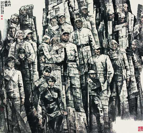 《太行鐵壁》借助傳統(tǒng)國畫技法與當(dāng)代壁畫表現(xiàn)手段,充分表現(xiàn)出中國軍民以堅(jiān)不可摧的斗志同仇敵愾、共御外辱的革命風(fēng)范。該作描繪的軍民形象既有中國共產(chǎn)黨的高級將領(lǐng),又有眾多普通將士和民眾。作者采用了將頗具個(gè)性風(fēng)采的人物造型與太行山勢融為一體的藝術(shù)手法,于壁立千仞的山脈中勾勒眾多可歌可泣的典型形象。朱德、彭德懷等高級將領(lǐng)和眾多無名英雄匯合在一起,和高聳巍峨的太行山同化為剛強(qiáng)挺拔的抗戰(zhàn)“長城”,構(gòu)建出一種不是浮雕勝似浮雕的美學(xué)意境。在這種紀(jì)念碑式的構(gòu)圖中,人物依山就勢地縱向組合成錯(cuò)落有致的行列,橫向間又彼此遙相呼應(yīng)、關(guān)聯(lián)密切。畫面中,朱德處于中心,其形體于挺括之間盡顯質(zhì)樸平實(shí)的風(fēng)格特征。立于他身前的是彭德懷、劉伯承、鄧小平,均側(cè)向左前方,從鄧小平緊閉的雙唇和左手插于褲袋的姿態(tài),可見其內(nèi)心的強(qiáng)大和堅(jiān)韌。彭德懷腳下則踏著一塊巨石,表現(xiàn)出其偉岸高大的形象。這幅畫融合中西繪畫技巧,將寫實(shí)造型手法、傳統(tǒng)水墨寫意與立體主義語言有機(jī)統(tǒng)一,成為太行軍民抗日的豐碑。