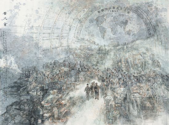解決了基本材料還要組織材料。畫面因?yàn)橄胍非蟠髨鼍?,就需要安排好具體的領(lǐng)袖和普通人的位置。大場景也是由許多個(gè)小場景組成的,必須在前期就做好布置和協(xié)調(diào)。但史實(shí)上,這個(gè)場景只是廣州中蘇友好大廈的機(jī)械大廳,展品種類并不多,參展人數(shù)也沒有那么多,怎樣才能畫出一個(gè)飽滿的畫面呢?為了反映廣交會(huì)的整體面貌,我們決定將陶瓷、紡織、農(nóng)產(chǎn)品等代表性場面搬進(jìn)來。第一屆廣交會(huì)參展客商1223名,并沒有人潮涌動(dòng)的感覺,為加強(qiáng)感染力,我們把后幾次交易會(huì)才出現(xiàn)的各國和少數(shù)民族代表都畫了進(jìn)來,將咨詢、講解、談判等場景融在一起。這樣就全面反映了早期廣交會(huì)的面貌,從而達(dá)到藝術(shù)性與真實(shí)性的統(tǒng)一。這些處理在和黨史專家溝通后得到了認(rèn)可。
