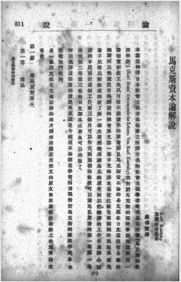 值得一提的是,擬作為《資本論解說》附錄一的《馬克斯傳》(威廉·里布列希著,戴季陶譯),已發(fā)表于1920年1月1日出版的《星期評(píng)論》第31號(hào)(新年號(hào))。戴季陶是以1906年日本出版的《社會(huì)主義研究》第一號(hào)所載志津野又郎譯本為主,并參照1919年《批評(píng)》所載的室伏高信譯本而轉(zhuǎn)譯。(威廉·里布列希著、戴季陶譯《馬克斯傳》,《星期評(píng)論》第31號(hào),1920年1月1日出版)而考茨基原著的《資本論解說》,則是1919年至1920年間,戴季陶與朱執(zhí)信、李漢俊分別合作,轉(zhuǎn)譯自日本高畠素之1910年的日譯本初版,在1919年11月1日出版的《建設(shè)》雜志第1卷第4號(hào)開始刊載,之后分別是第1卷第5-6號(hào),第2卷第2-3號(hào)、第5號(hào),直至1920年12月1日出版的第3卷第1號(hào),共連載七期。后來由胡漢民補(bǔ)譯并作校訂,于1927年由上海民智書局出版。(考茨基著,戴季陶、朱執(zhí)信、李漢俊、胡漢民譯《資本論解說》,戴季陶序一、胡漢民序二,上海民智書局1927年版)這個(gè)正式出版的版本,自然沒有了1920年計(jì)劃中的《共產(chǎn)黨宣言》等附錄。