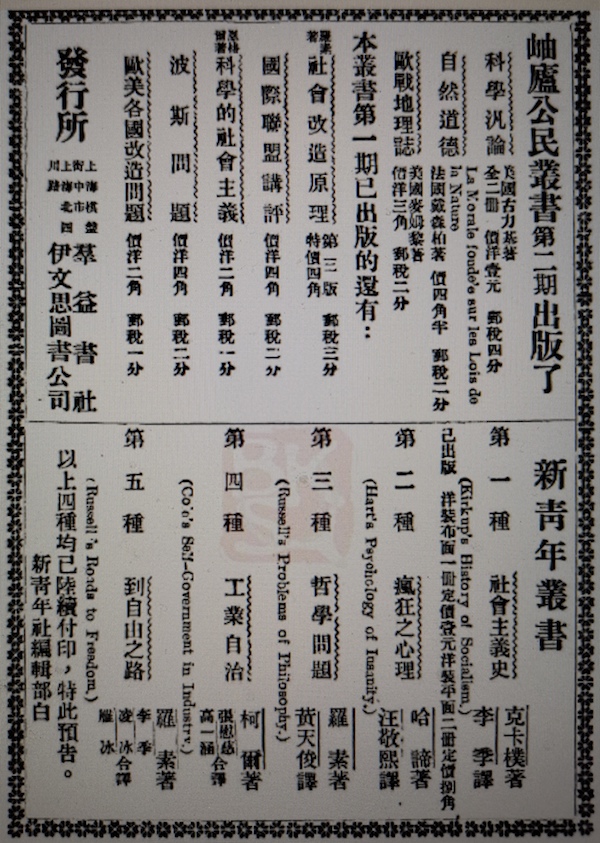 1920年11月1日出版的《新青年》第8卷第3號(hào)封二上,刊出“岫廬公民叢書第二期出版了”與“新青年叢書”的兩則廣告,其中,前者為首次刊登。之后又連續(xù)刊登六期,分別為第8卷第4號(hào)(1920年12月1日出版)、5號(hào)(1921年1月1日出版)、6號(hào),第9卷第1號(hào)(1921年5月1日出版)、2號(hào)(1921年6月2日后出版)、3號(hào)(1921年7月1日出版)。該廣告介紹“岫廬公民叢書”共八種,第二期有《科學(xué)泛論》、《自然道德》、《歐戰(zhàn)地理志》,第一期有《社會(huì)改造原理》(當(dāng)時(shí)已出第三版)、《國(guó)際聯(lián)盟講評(píng)》、《科學(xué)的社會(huì)主義》、《波斯問題》、《歐美各國(guó)改造問題》。叢書由群益書社和伊文思圖書公司發(fā)行。(“岫廬公民叢書第二期出版了”,《新青年》第8卷第3號(hào)封二廣告,上海新青年社1920年11月1日出版。參見高明:《王云五、公民書局、“公民叢書”與1920年代早期馬克思主義的傳播》)