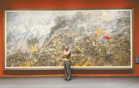 1991年,丹東抗美援朝紀念館籌建時,請王鐵牛等7位畫家創(chuàng)作一件長132米、高16米的巨幅油畫《清川江畔圍殲戰(zhàn)》。為此,他們赴朝鮮考察半個月,訪問了8個城市?!拔覀儏⒂^了抗美援朝昔日的戰(zhàn)場、平壤的祖國解放戰(zhàn)爭勝利紀念館、板門店的三八線……對抗美援朝戰(zhàn)爭有了全面的了解,對朝鮮戰(zhàn)場的實景、志愿軍的形象也積累了豐富的素材?!彼€找來相關(guān)書籍、史料、影像資料深入研究。經(jīng)過兩年的創(chuàng)作,這件作品全景式地描繪出志愿軍成功堵截企圖南逃的美國侵略者的場景,廣受好評。十幾年前,他又受南京軍區(qū)之邀創(chuàng)作了《上甘嶺·1952》。12年的軍旅生涯和幾次相關(guān)創(chuàng)作經(jīng)歷,都為王鐵牛這一次繪制《上甘嶺戰(zhàn)役》設(shè)下了伏筆?!拔业哪繕耸羌纫憩F(xiàn)志愿軍戰(zhàn)士的英雄形象,又要很好地展示上甘嶺戰(zhàn)役的宏大空間環(huán)境,力圖較全面地展示戰(zhàn)役級的戰(zhàn)爭圖景?!?/p>