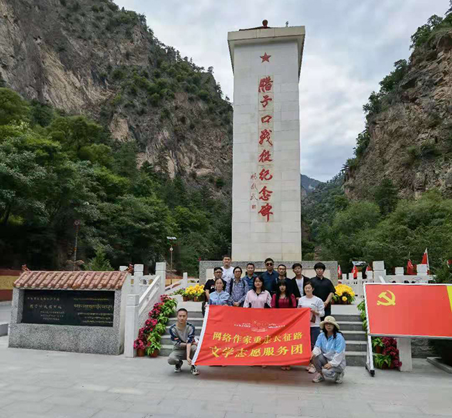 網(wǎng)絡(luò)作家重走長(zhǎng)征路文學(xué)志愿服務(wù)團(tuán)在臘子口戰(zhàn)役紀(jì)念碑前合影