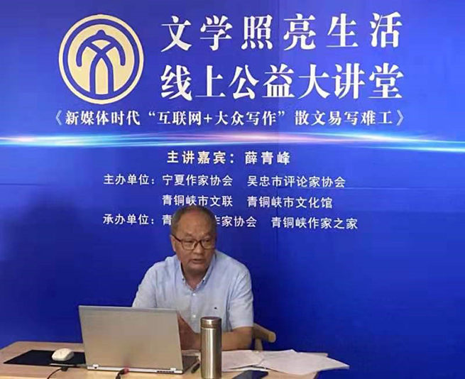6月27日上午,為迎接中國(guó)共產(chǎn)黨100歲華誕,貫徹落實(shí)習(xí)近平總書記關(guān)于文藝工作的重要論述,發(fā)揮文藝工作者以文化人、以文育人的優(yōu)勢(shì),由寧夏作家協(xié)會(huì)、吳忠市文藝評(píng)論家協(xié)會(huì)、青銅峽市文聯(lián)、青銅峽市文化館主辦,青銅峽市作家協(xié)會(huì)、青銅峽作家之家創(chuàng)研培訓(xùn)基地承辦的“文學(xué)照亮生活”線上線下公益大講堂在青銅峽作家之家成功舉辦。寧夏作家協(xié)會(huì)副秘書長(zhǎng)張濤主持并致辭。國(guó)家二級(jí)作家、寧夏理工學(xué)院副教授、石嘴山市文藝評(píng)論家協(xié)會(huì)主席薛青峰受邀擔(dān)任主講嘉賓。