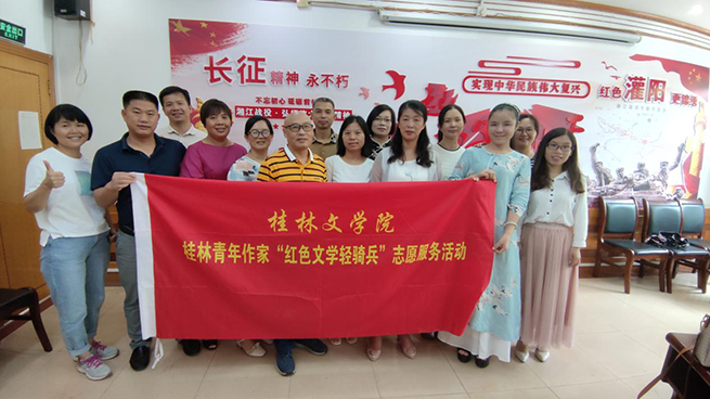 桂林青年作家“紅色文學(xué)輕騎兵”志愿服務(wù)項目由桂林文學(xué)院組織實施,志愿者主要由桂林文學(xué)院簽約作家、文學(xué)愛好者組成,是中國作家協(xié)會文學(xué)志愿服務(wù)示范性重點(diǎn)扶持項目。今年以來,該團(tuán)隊緊緊圍繞“慶祝中國共產(chǎn)黨成立100周年”這一主題,深入農(nóng)村、社區(qū)、學(xué)校、企業(yè),開展了紅色經(jīng)典閱讀分享會、“重走長征路”主題創(chuàng)作實踐、送文學(xué)下基層等一系列志愿服務(wù)活動。