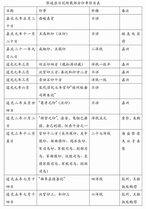 再次,張廷濟(jì)日記還記載不少印章的價格,為研究嘉道時期金石學(xué)的市場流通提供了有價值的材料。茲將張廷濟(jì)日記中相關(guān)印章價目表排列如下: