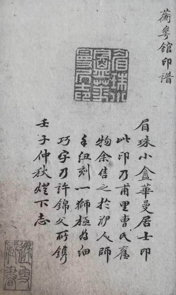王韜日記中保留諸多本人的印章信息,僅臺灣傅斯年圖書館所藏《蘅華館雜錄》六冊,就保存王氏“蘭卿”“蘅華館主”“家住吳淞第六泉”“瑯邪珍賞”“蘅華溪館”“遯叟藏書”“長洲王韜”“紅蕤閣女史”“淞北倦民”“此心聊與此山盟”等印。王韜《蘅華館雜錄》第四冊咸豐三年九月至咸豐四年五月之間,存有《蘅華館印譜》一種共11頁,鈐印20方,每一鈐印均記載印章釋文,印章來源概況等。如印譜第一頁,“眉珠小庵華曼居士印”,釋文“此印乃甫里曹氏舊物,余售之于洢人師手。紐刻一獅,極為細(xì)巧,字乃許錦父所鐫。壬子仲秋燈下志。”這些都是印章研究足資采用的材料。