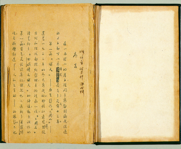 其中,《故事新編》手稿是上海魯迅紀(jì)念館的重要館藏?!豆适滦戮帯肥且陨裨拏髡f和歷史人物為題材創(chuàng)作的小說。收魯迅1922 年至1935 年所作小說8 篇,分別為《補(bǔ)天》《奔月》《理水》《采薇》《鑄劍》《出關(guān)》《非攻》《起死》。