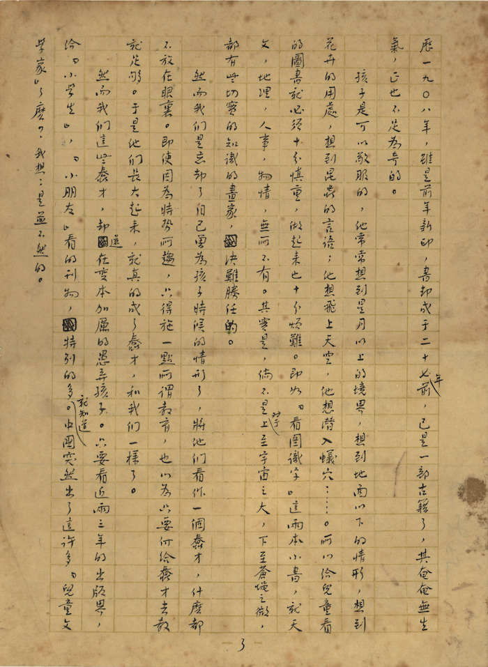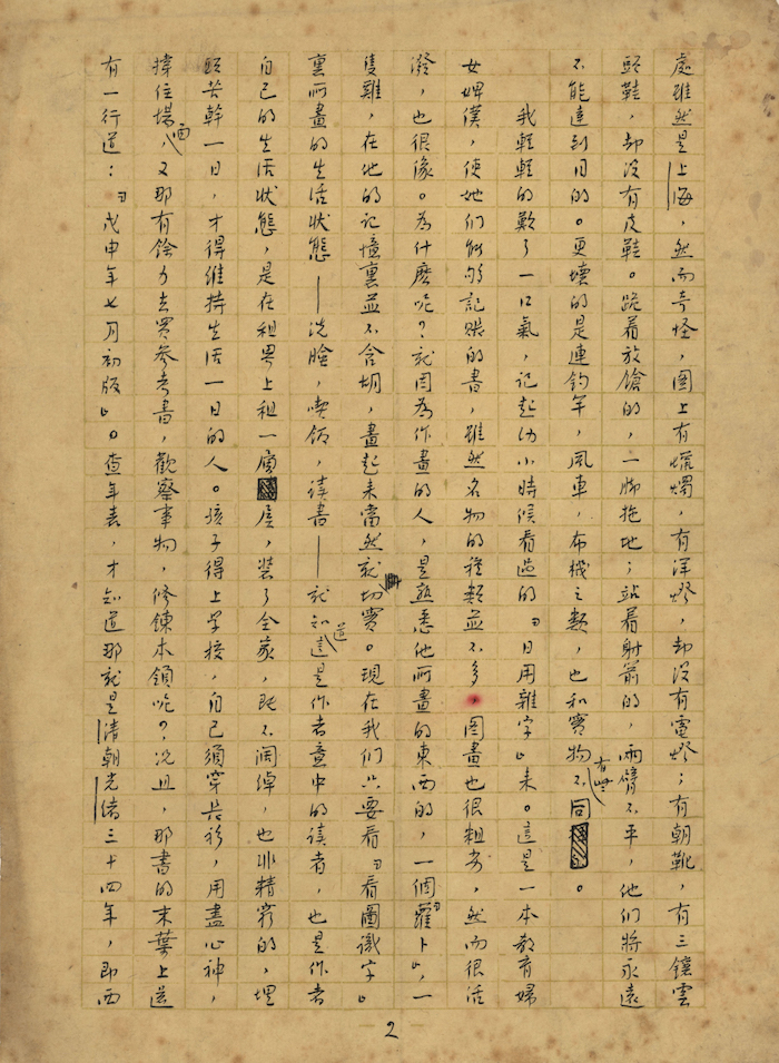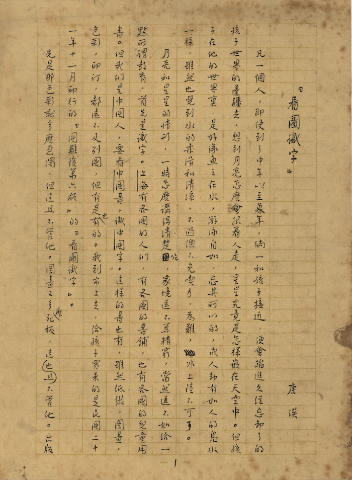 展品《看圖識字》手稿則是魯迅作于1934年5月。文章主旨是談兒童識字教材問題,指出當(dāng)時(shí)暢銷的兒童識字本是“二十七年前”編定的,書中內(nèi)容以及圖像與1930年代脫節(jié)。