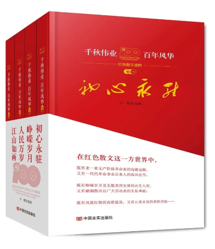 《千秋偉業(yè) 百年風(fēng)華》這套書包括《初心永駐》《崢嶸歲月》《人民萬歲》《江山如畫》4卷,精選了老一輩無產(chǎn)階級(jí)革命家、現(xiàn)當(dāng)代著名作家撰寫的數(shù)百篇紅色經(jīng)典散文。作者們或以親身經(jīng)歷或通過深度現(xiàn)場(chǎng)采訪和細(xì)致的資料爬梳,記錄了一段偉大而榮光的崢嶸歲月,描繪出一幅中國革命、建設(shè)、改革以及新時(shí)代波瀾壯闊的宏偉畫卷。書中既有老一輩無產(chǎn)階級(jí)革命家的高瞻遠(yuǎn)矚、抒情言志,又有一代代革命事業(yè)后來人的嘉言懿行、高風(fēng)亮節(jié);既有崢嶸歲月里無數(shù)英烈先賢的壯懷激烈、出生入死,又有硝煙散盡后廣大勞動(dòng)者的艱苦創(chuàng)業(yè)、無私奉獻(xiàn);既有風(fēng)展紅旗的高歌猛進(jìn),又有山重水復(fù)的曲折回旋;既有踏訪革命圣地的綿綿思緒,又有沉吟紅色經(jīng)典的涌動(dòng)情潮……全書飽含著家國情懷、人民情懷,彰顯著愛國主義精神、英雄主義精神,承載著熠熠生輝的思想光澤和精神力量,堪為進(jìn)行紅色革命傳統(tǒng)教育的寶貴教材。