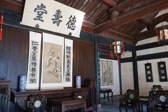 老臺(tái)門的廳堂是周氏族人的公共活動(dòng)場(chǎng)所,以作喜慶、祝福和宴會(huì)賓客之用。廳堂正上方高懸一塊大匾“德壽堂”,兩旁柱子上有一副紅底黑字的楹聯(lián):“品節(jié)詳明德性堅(jiān)定 事理通達(dá)心氣和平”。