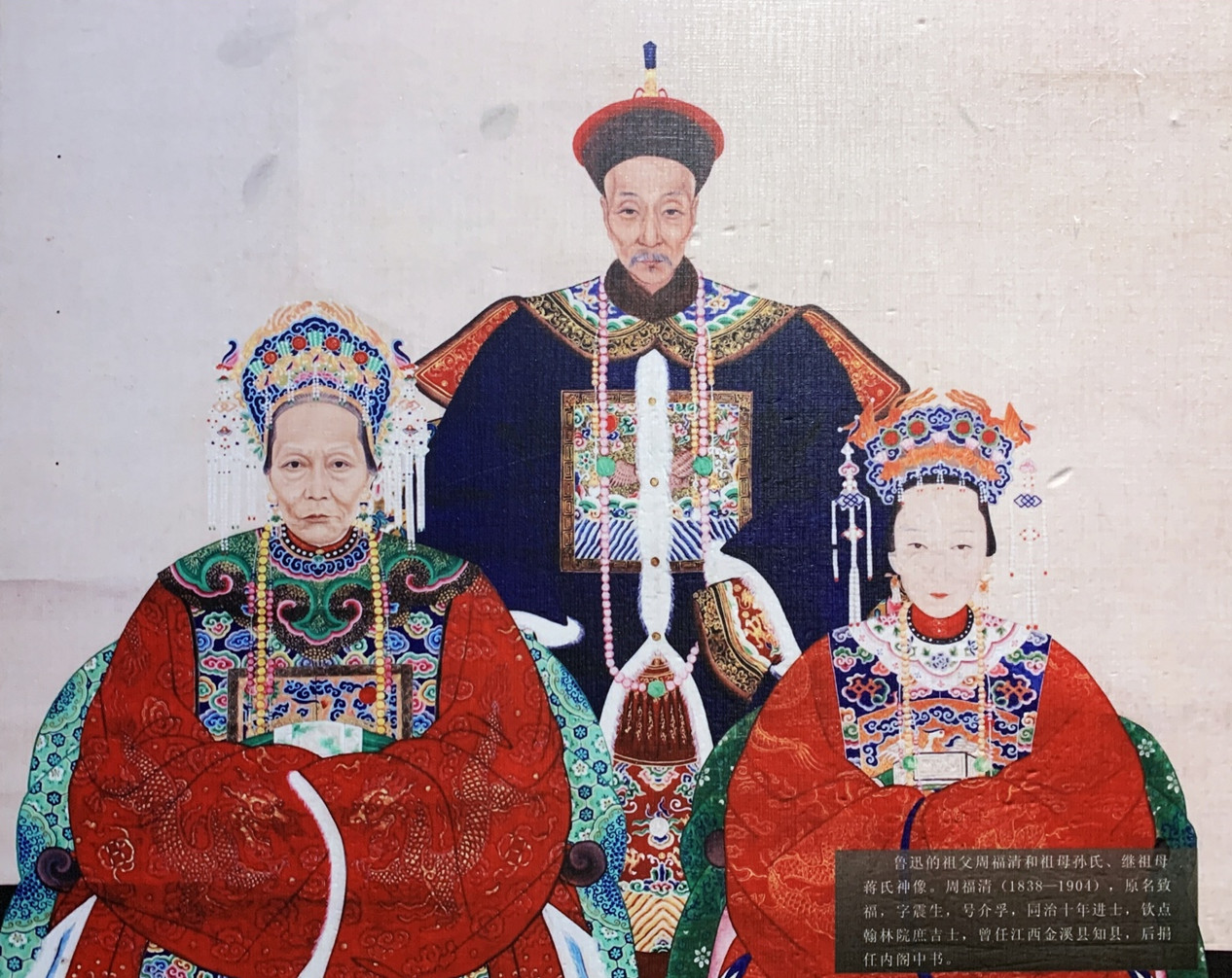魯迅的祖父周福清(字介孚,1838-1904),同治十年進(jìn)士,欽點(diǎn)翰林院庶吉士,曾任江西金溪縣知縣,后捐任內(nèi)閣中書。后因科場(chǎng)案入獄。圖為紹興魯迅故居內(nèi)魯迅祖父周福清和祖母孫氏、繼祖母蔣氏的畫像。