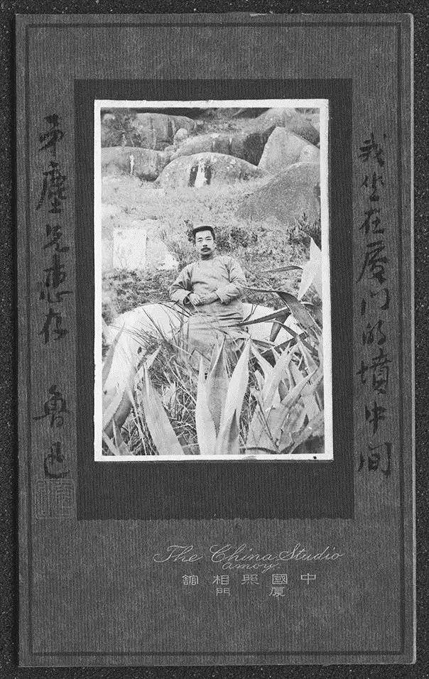 1927年1月2日攝于廈門。魯迅對(duì)廈門大學(xué)的人際關(guān)系感到厭煩,且不適應(yīng)當(dāng)?shù)厣?,不足半年就決意離開(kāi)。臨行前,魯迅、林語(yǔ)堂與幾個(gè)學(xué)生在南普陀寺西南的小山崗上照相,這里到處生長(zhǎng)著魯迅喜愛(ài)的龍舌蘭,滿山是饅頭一樣的洋灰的墳?zāi)?。魯迅寫信給許廣平說(shuō):“今天照了一個(gè)照相,是在草木叢中,坐在一個(gè)洋灰的墳的祭桌上”。魯迅后來(lái)把照片用在雜文集《墳》中。他還在照片上題寫“我坐在廈門的墳中間”贈(zèng)給章廷謙(矛塵)。照片上標(biāo)有:The China Studio, Amoy(廈門中國(guó)照相館)。
