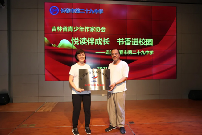 活動(dòng)開(kāi)始前,于德北與二十九中有關(guān)負(fù)責(zé)人共同為吉林省青少年作家協(xié)會(huì)小作家培養(yǎng)基地揭牌。