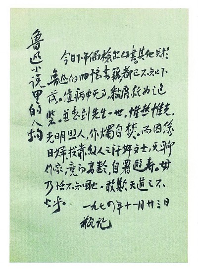 又如在《司馬溫公書牘》書衣上寫下的“世界輿論:亞洲一盞明燈熄滅了。謂周(總理)之死。強忍熱淚聽廣播?!北磉_對周總理逝世的傷感。