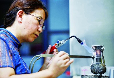 成都銀花絲制作技藝傳承人道安在制作雙耳牡丹花瓶擺件。新華社發(fā)
